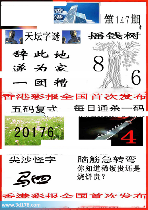 3d之家3d香港彩报第16147期摇钱树:本期3d香港彩报图详情如下:天坛字谜:辞此地,遂为家,一团糟。摇钱树:8 6五码复式:20176每日通杀一码:4尖沙怪字:驷脑筋急转筋:你知道稀饭贵还是烧饼贵?该香港彩报由3d之家3d图库频道原创,仅供彩民参考,温馨提供。