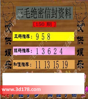 3d之家第2016150期三毛绝密信封资料图:福彩3d第150期三毛绝密信封资料图详解:三码推荐:958旺码推荐:13624和值推荐:11 13 15 19三毛图库由3D之家3D图库频道原创,仅供彩民参考,温馨提供。