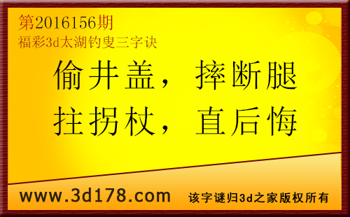 第16156太湖字谜解太湖钓叟三字诀:福彩3d第2016156期太湖图库解字谜详解:偷井盖:水井上面的盖子,有0防2;摔断腿:腿摔断了,解7有1;拄拐杖:拄着拐杖,有1解3;直后悔:一直后悔着,防0解1;六码复式:012367(防组三)精选10注:013 137 126 267 367 067 167 166 377 0013d太湖图库由3d之家3D图库频道原创,仅供彩民参考,温馨提供。