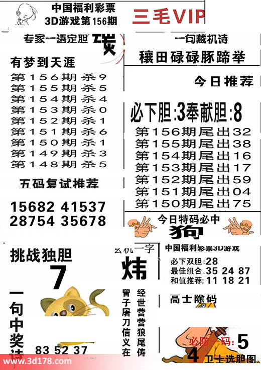 第2016156期3d三毛图库为您解读本期专家一语定胆:3d第2016156期三毛图库VIP详解:第2016156期杀一码推荐:9必下双胆:28挑战独胆:7五码复式推荐:15682 41537 28754 35678今日特码必中:狗最佳组合:35 24 87和值推荐:11 18 21玄机一字:炜该三毛玄机解码图由3d之家3d图库频道原创,仅供彩民参考,温馨提供。
