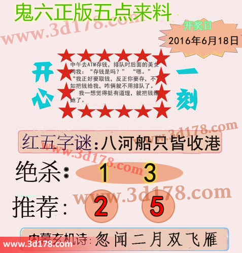 3d鬼六图库第16163期鬼六正版五点来料图:字谜:八河船只皆收港