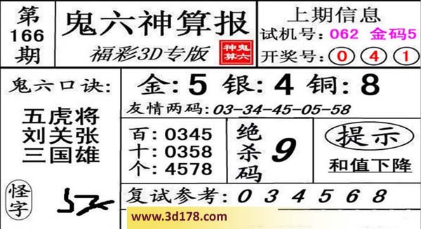 3d第16166期鬼六神算报为您推荐鬼六口诀: