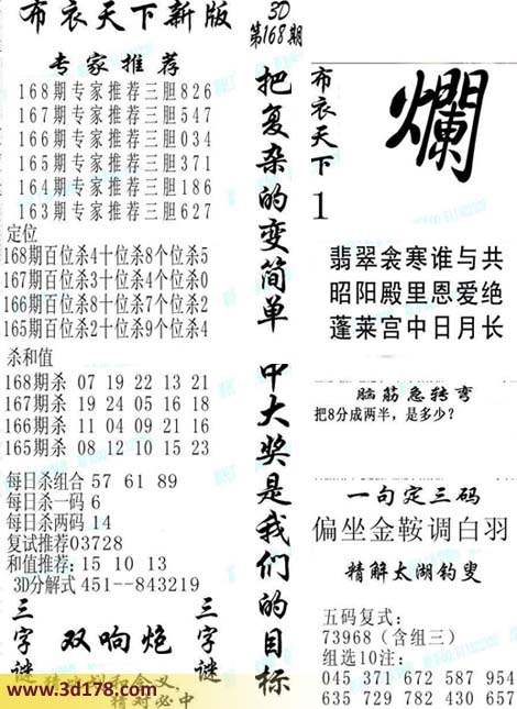 福彩3d第2016168期福彩3d布衣天下新版: