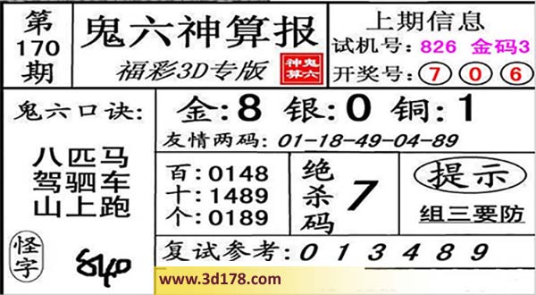 3d第16170期鬼六神算报为您推荐鬼六口诀: