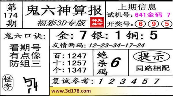3d第16174期鬼六神算报为您推荐鬼六口诀: