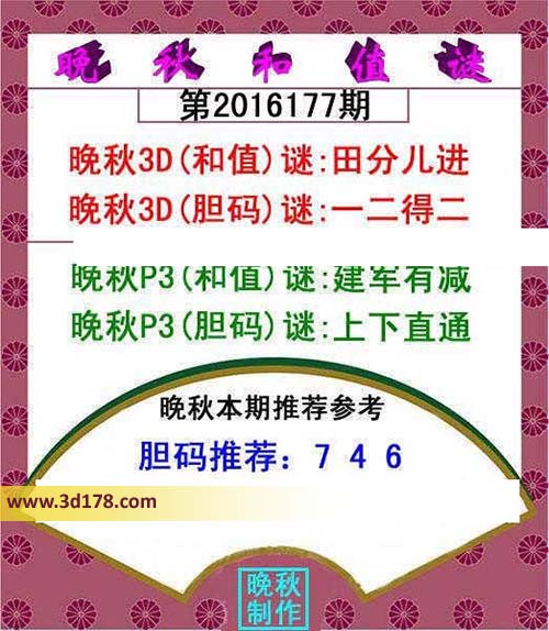 晚秋3D(和值)谜:田分儿进