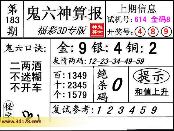 3d第16183期鬼六神算报为您推荐鬼六口诀:
