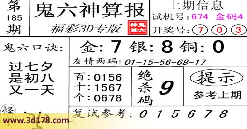 3d第16185期鬼六神算报为您推荐鬼六口诀: