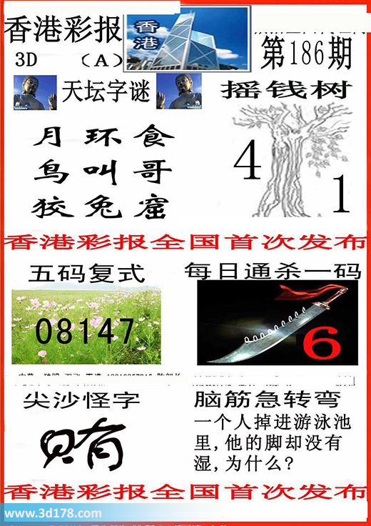 3d之家3d香港彩报第16186期摇钱树:本期3d香港彩报图详情如下:天坛字谜:月环食,鸟叫哥,狡兔窟。摇钱树:4 1五码复式:08147每日通杀一码:6尖沙怪字:贿脑筋急转筋:一个人掉进游泳池里,他的脚却没有湿,为什么?该香港彩报由3d之家3d图库频道原创,仅供彩民参考,温馨提供。