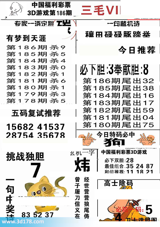 第2016186期3d三毛图库为您解读本期专家一语定胆:3d第2016186期三毛图库VIP详解:第2016186期杀一码推荐:9必下双胆:28挑战独胆:7五码复式推荐:15682 41537 28754 35678今日特码必中:狗最佳组合:35 24 87和值推荐:11 18 21玄机一字:炜该三毛玄机解码图由3d之家3d图库频道原创,仅供彩民参考,温馨提供。