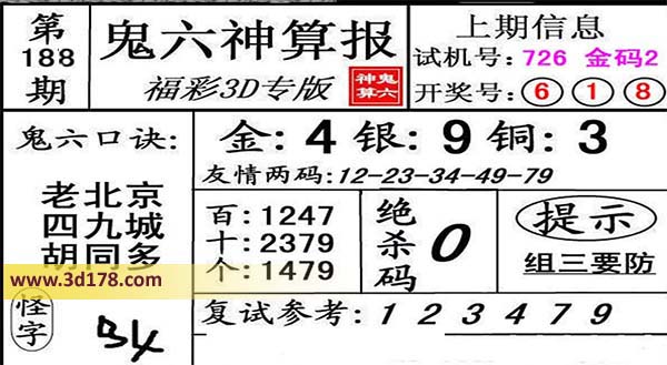 3d第16188期鬼六神算报为您推荐鬼六口诀: