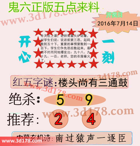 3d鬼六图库第16189期鬼六正版五点来料图:字谜:楼头尚有三通鼓