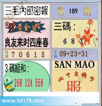 福彩3d第189期三毛内部密报综合推荐如下:3d之家三毛图库第16189期三毛内部密报图详解:黄金策略:良友来时四座春三码:683旺码:706153码组合:268 124 558玄机:09+23=31必中玄机字:服该三毛内部密报图库由3d之家3d图库频道原创,仅供彩民参考,温馨提醒。