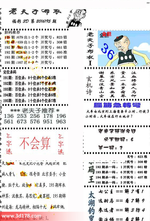 3d第2016195期老夫子布衣预测今日必下胆码图:3d之家第16195期老夫子布衣图库详解:195期:167 出1-2个 开奖号:195期:百位杀1 十位杀4 个位杀7老夫子精选推荐:136 253 256 178 196 561 673 576 951 963老夫子预测今日必下胆6,杀一码2脑筋急转弯:火车由北京到上海需要6小时,行驶3小时后,火车该在什么地方?该布衣图库由3d之家3d图库频道原创,仅供彩民参考,温馨提供。