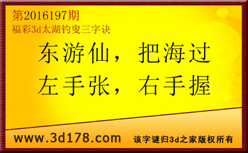 福彩3d第2016197期太湖图库解字谜详解:东游仙:八仙过嗨,各显神通,解:8;把海过:海有两岸,过海过两岸,解:2;:左手张开,手有五指,解:5;:右手握住,我成拳头,解:0;六码复式:025789(防组三)精选10注:025 257 578 789 027 028 029 258 259 0793d太湖图库由3d之家3D图库频道原创,仅供彩民参考,温馨提供。