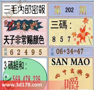 3d之家三毛图库第16202期三毛内部密报图详解:黄金策略:天子非常赐颜色三码:857旺码:245693码组合:569 478 236玄机:06+34=47必中玄机字:嚼