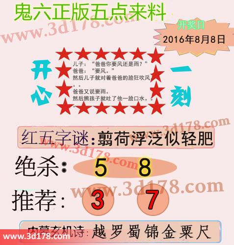 福彩第16214期3d鬼六五点来料图详解:3d鬼六图库第16214期鬼六正版五点来料图:字谜:翦荷浮泛似轻肥绝杀:5 8两胆码推荐:3 7内幕玄机诗:越罗蜀锦金粟尺该鬼六图库由3d之家3d图库频道原创,仅供彩民参考,温馨提供。