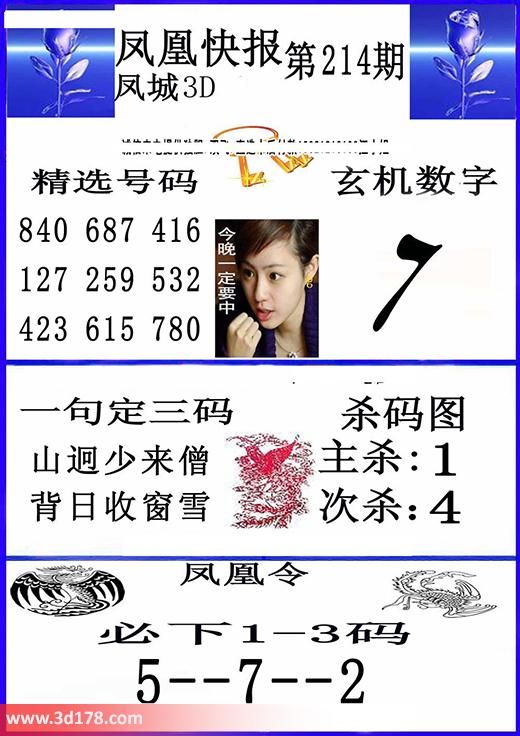 福彩3d凤凰快报图第16214期精选号码推荐:3d第16214期凤凰快报内容解析:玄机数字:7精选号码:840 687 416 127 259 532 423 615 780一句定三码:山迥少来僧,背日收窗雪。杀码图:主杀:1 次杀:4凤凰令:必下1-3码,5--7--2该凤凰快报图库由3d之家3d图库频道原创,仅供彩民参考,温馨提供。