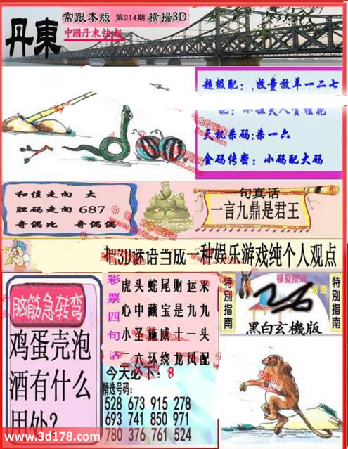 3d之家第2016214期丹东快报图:3d第2016214期丹东快报图详解:超级配:牧童放羊一二七配:小姐夫人赏桂花天机杀码:杀一六和值走向:大胆码走向:687奇偶比:奇偶偶金码传密:小码配大码精选号码:528 673 915 278 693 741 850 971 780 376 761 524脑筋急转弯:鸡蛋壳泡酒有什么用处?该丹东图库由3d之家3d图库频道原创,仅供彩民参考,温馨提供。