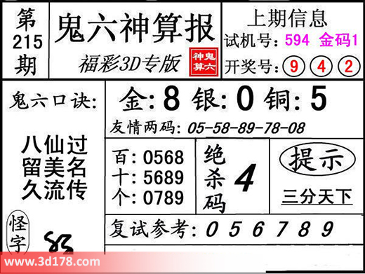 本期3d鬼六图库精解如下:鬼六口诀:八仙过,留美名,久流传