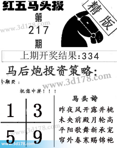 3d第2016217期红五马头报本期马头诗详解:上期开奖号码:334