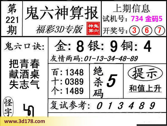 3d第16221期鬼六神算报为您推荐鬼六口诀: