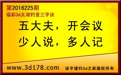 福彩3d第2016225期太湖图库解字谜详解:五大夫:大夫的现代的医生的称呼,明码解5;