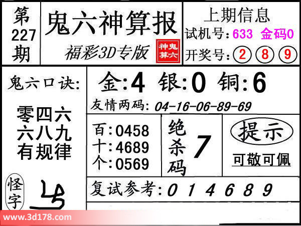 本期3d鬼六图库精解如下:鬼六口诀:零四六,六八九,有规律