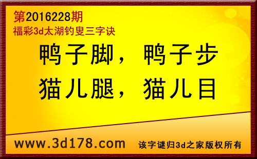 福彩3d第2016228期太湖图库解字谜详解:鸭子脚:鸭子的脚为了适应水中生活,连在了一起,解1;