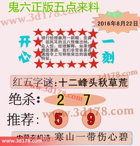 3d鬼六图库第16228期鬼六正版五点来料图:字谜:十二峰头秋草荒