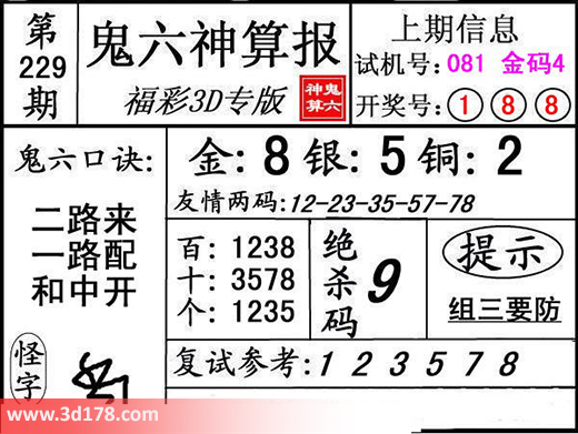本期3d鬼六图库精解如下:鬼六口诀:二路来,一路配,和中开