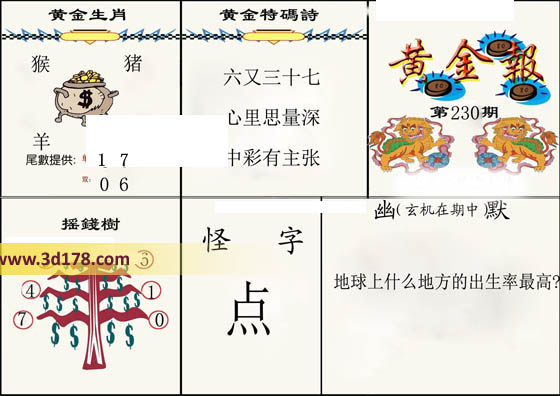 福彩3d第2016230期3d黄金报为您推荐黄金特码: