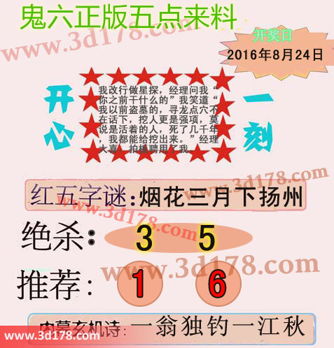 3d鬼六图库第16230期鬼六正版五点来料图:字谜:烟花三月下扬州