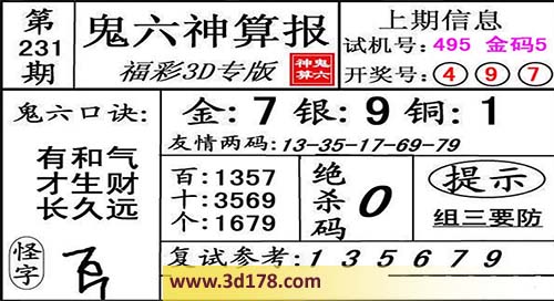 3d第16231期鬼六神算报为您推荐鬼六口诀: