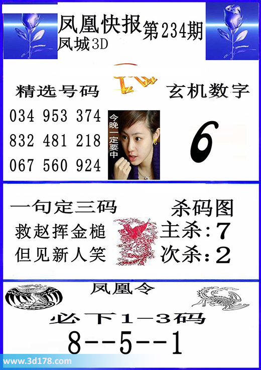 福彩3d凤凰快报图第16234期精选号码推荐:3d第2016234期凤凰快报内容解析:玄机数字:6精选号码:034 953 374 832 481 218 067 560 924一句定三码:救赵挥金槌,但见新人笑。杀码图:主杀:7 次杀:2凤凰令:必下1-3码,8--5--1该凤凰快报图库由3d之家3d图库频道原创,仅供彩民参考,温馨提供