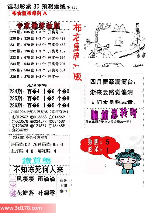 福彩3d第2016236期布衣天皇帝A版布衣专家独家推荐: