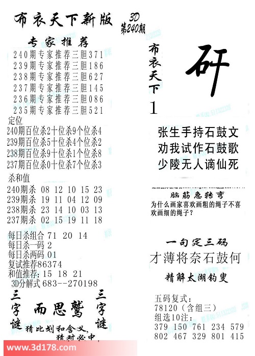 福彩3d第2016240期福彩3d布衣天下新版: