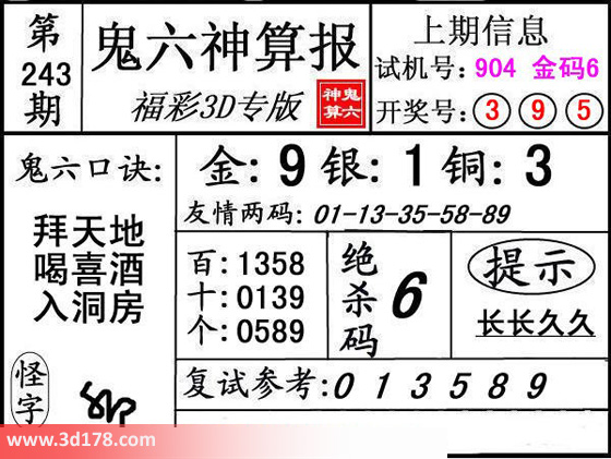 3d第16243期鬼六神算报为您推荐鬼六口诀: