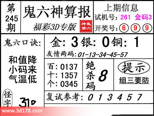 本期3d鬼六图库精解如下:鬼六口诀:和值降,小码来,气温低