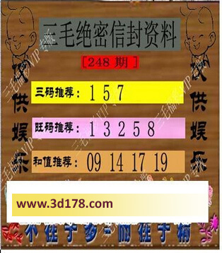3d之家第2016248期三毛绝密信封资料图:福彩3d第248期三毛绝密信封资料图详解:三码推荐:157旺码推荐:12358和值推荐:9 14 17 19三毛图库由3d之家3d图库频道原创,仅供彩民参考,温馨提供。