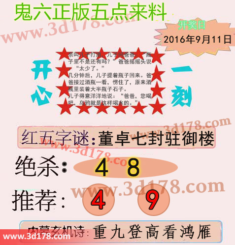 福彩第16248期3d鬼六五点来料图详解:3d鬼六图库第16248期鬼六正版五点来料图:字谜:董卓七封驻御楼绝杀:5 8两胆码推荐:4 9内幕玄机诗:重九登高看鸿雁该鬼六图库由3d之家3d图库频道原创,仅供彩民参考,温馨提供。