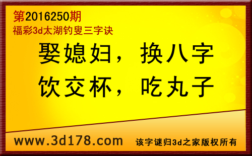 福彩3d第2016250期太湖图库解字谜详解:娶媳妇——是办喜事的大喜之日,娶妻子,妻谐音解7;