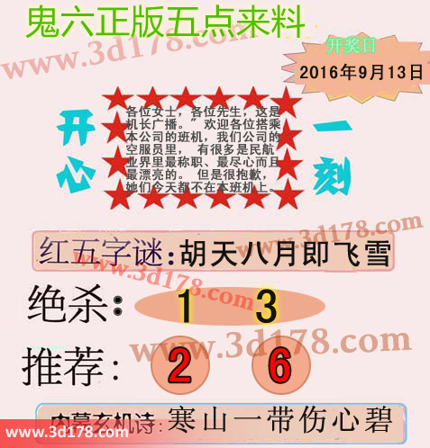3d鬼六图库第16250期鬼六正版五点来料图:字谜:胡天八月即飞雪