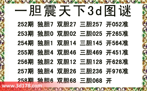 258期 独胆6 双胆68 三胆068 开一胆震天下三胆图库由3d之家3d图库频道原创,仅供彩民参考,温馨提供。