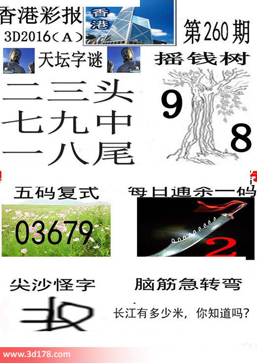 3d之家3d香港彩报第16260期摇钱树:本期3d香港彩报图详情如下:天坛字谜:二三头,七九中,一八尾。摇钱树:9 8五码复式:03679每日通杀一码:2脑筋急转筋:长江有多少米,你知道吗?该香港彩报由3d之家3d图库频道原创,仅供彩民参考,温馨提供。
