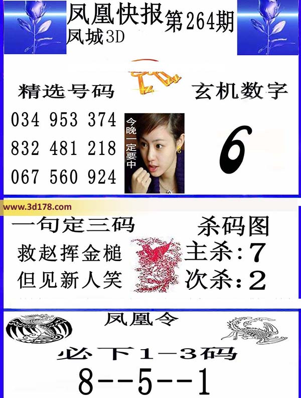 福彩3d凤凰快报图第16264期精选号码推荐:
