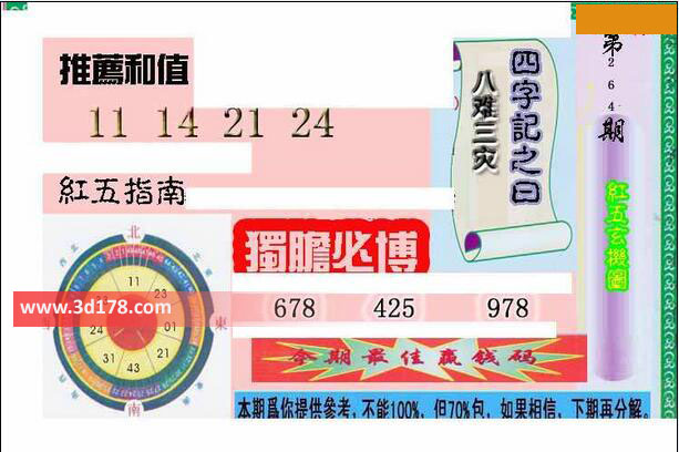 福彩3d第2016264期红五玄机图详细内容:推荐和值:11 14 21 24独胆必博:678 425 978四字记之曰:八难三灾该红五图库由3d之家3d图库频道原创,仅供彩民参考,温馨提供。