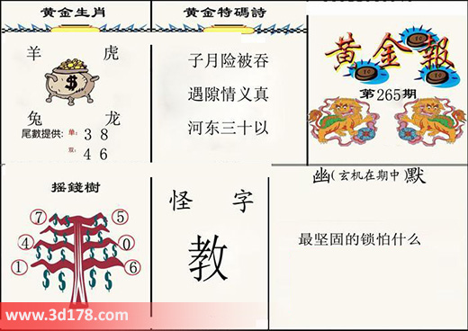 福彩3d第2016265期3d黄金报为您推荐黄金特码:3d之家第2016265期3d黄金报详细内容如下:黄金特码诗:子月险被吞,遇隙情义真,河东三十以。黄金生肖:羊虎兔龙尾数推荐:单:3 双:4 6摇钱树:741 506怪字:教幽默(玄机在期中):最坚固的锁怕什么?黄金报图由3D之家3D图库频道原创,仅供彩民参考,温馨提供。