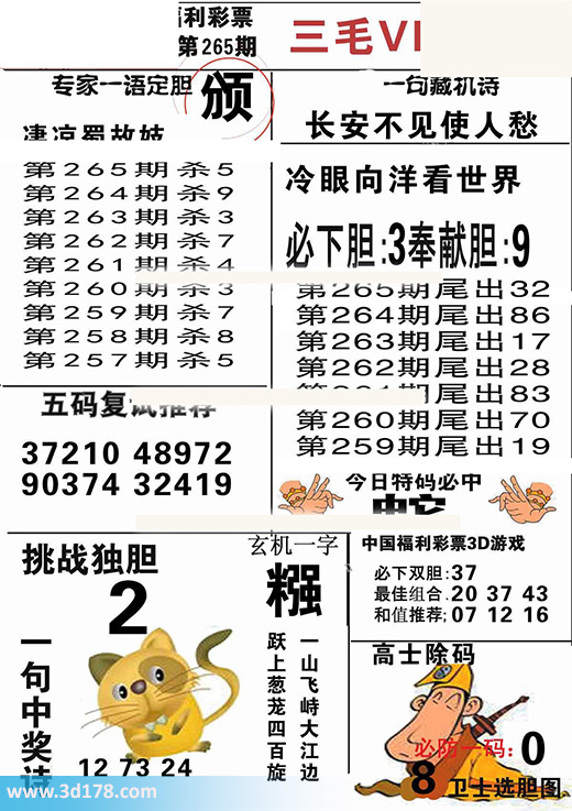 福彩3d第2016265期三毛VIP:3d第2016265期三毛VIP详解:一句藏机诗:长安不见使人愁第2016265期杀一码推荐:5必下双胆:37 挑战独胆:2五码复式推荐:37210 48972 90374 32419今日特码必中:蛇最佳组合:20 37 43和值推荐:07 12 16玄机一字:糨一句中奖诗:跃上葱茏四百旋,一山飞峙大江边。该三毛玄机解码图由3d之家3d图库频道原创,仅供彩民参考,温馨提供。