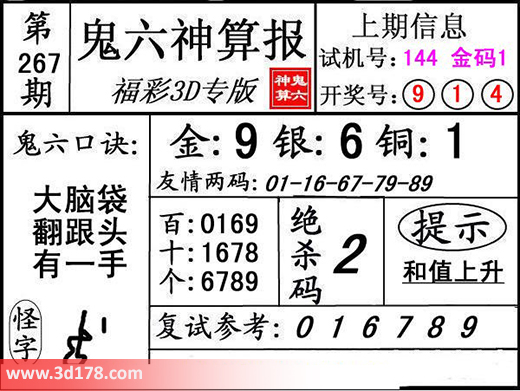 3d第16267期鬼六神算报为您推荐鬼六口诀: